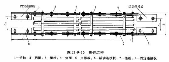 拖鏈由兩條或兩條以上的平行鏈帶、支撐板、銷軸和連接板組成。兩鏈帶之間用支撐板相互連接,支撐板和鏈板間用銷軸連接,支撐板上開孔用來支撐和拖動(dòng)電線、電纜或軟管。支撐板可以是整塊的,也可分開成兩塊,以利于軟管安裝。板上的孔為圓形或矩形,也可按用戶要求開孔。拖鏈一端為固定連接板,與機(jī)器上的固定件連接或固定于地面,另一端為活動(dòng)連接板,與機(jī)器上的活動(dòng)部件連接,隨活動(dòng)件一起運(yùn)動(dòng)。